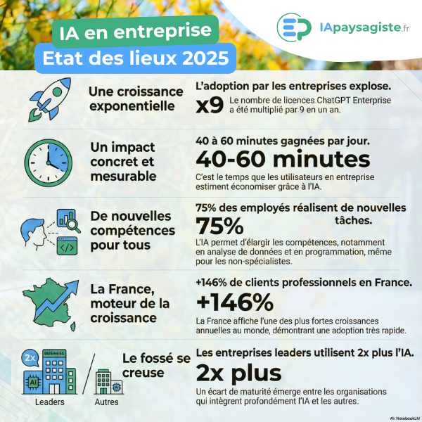 L'un des enseignements majeurs de cette année 2025, c'est que l'impact de l'IA n'est plus théorique. Les utilisateurs en entreprise estiment économiser entre 40 et 60 minutes par jour grâce à ces outils. Pour un paysagiste, cela représente une heure récupérée sur les tâches administratives, la rédaction de devis, l'analyse de documents techniques ou la création de contenu pour vos réseaux sociaux.